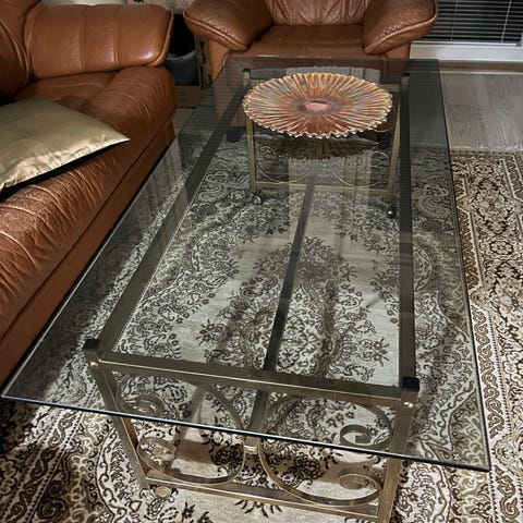Myydään hyväkuntoinen "uusvanha" messinkirunkoinen iso lasipöytä. Irroitettava tumma lasilevy 90x90cm, korkeus maasta lasilevyyn 47cm. Jaloissa liimajälkiä suojateippauksesta, poistettavissa (poisto jää ostajalle). Toimitus: Vain nouto Espoosta, maksu paikanpäällä.