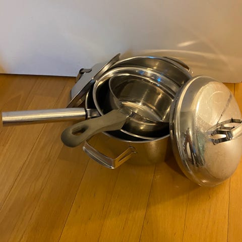 Myydään kuvan mukaiset emalikattilat ja kattilakannet yhteishintaan 20 euroa (nämä käyvät induktioliedelle).