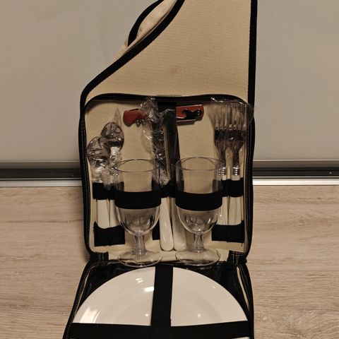 Sisältää puistoruokailuun tarvikkeet viltillä.