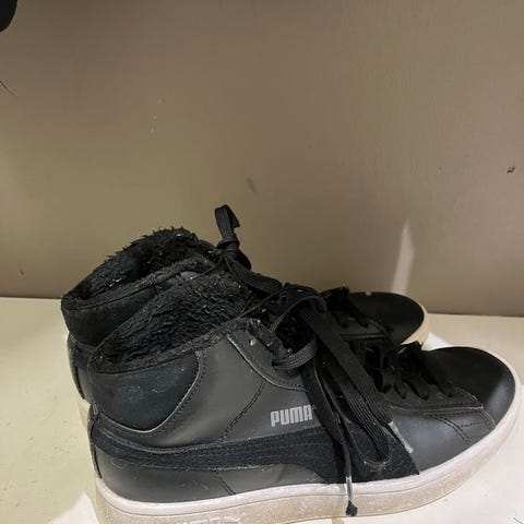 Nahkaiset mustat ehjät Pumat joutilaana.