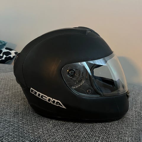 Sininen käyttämättömäksi jäänyt kypärä. Paljon käytetty mutta vielä käyttöikää jäljellä, lähinnä sisäosissa näkyy kulumat ja käyttö. Koko n. 58-60. Visiiri ja etuosa nousee. Pinnassa joitakin naarmuja säilytyksen ja käytön jäljiltä. Omistaja muistelinettä BMW kypärä.