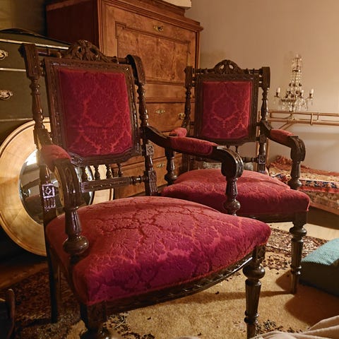Kauniit, Italialaiset Kruunukalusteen tuolit. Kangas on sileää persikansävyistä plyyshiä. Myydään yhdessä, on yhteishinta.