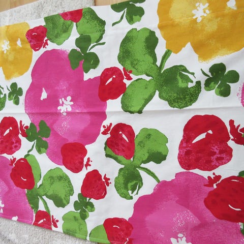 En tiedä kankaan nimeä, mutta kankaassa on valkoisella pohjalla tyyliteltyjä keltaisia kukkia.