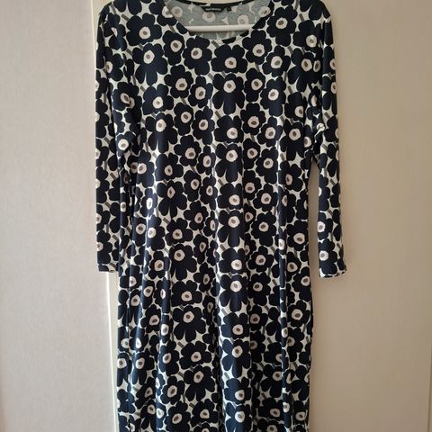 A linjainen ja taskullinen Marimekon Aretta trikoomekko. Erinomainen kunto. Kerran pesty. Pohja beige, kukat tummansininen, keskus valkoinen ja musta. Pituus hiukan polven yläpuolelle 169 cm pituisella. Mahtuu myös L kokoiselle.