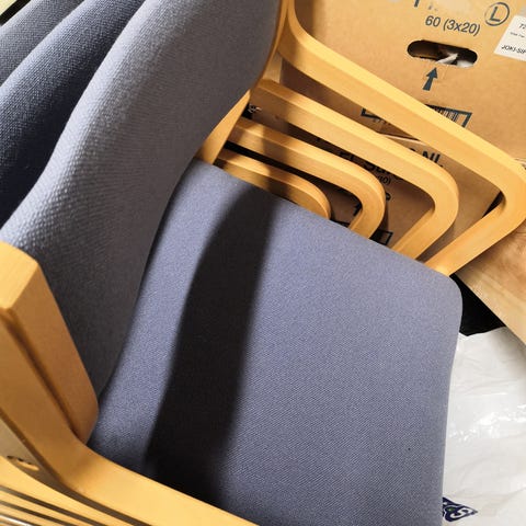 Form 284, istuin ja selkänoja verhoiltu Gaja-punaisella, käsinojat ruskeaa puuta, jalusta alumiinia. Istuimen korkeus - 46cm .11 kpl / 1 kpl=10e . Kaikki 11 kpl.=90e / Tarjoa