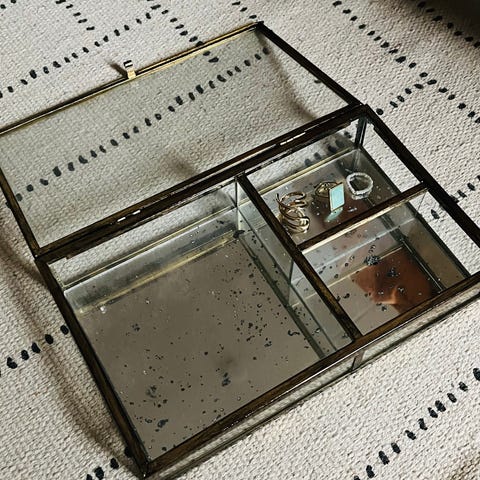 Säilytysrasia sinisellä lasilla. Noin 10cm nupista pohjaan.