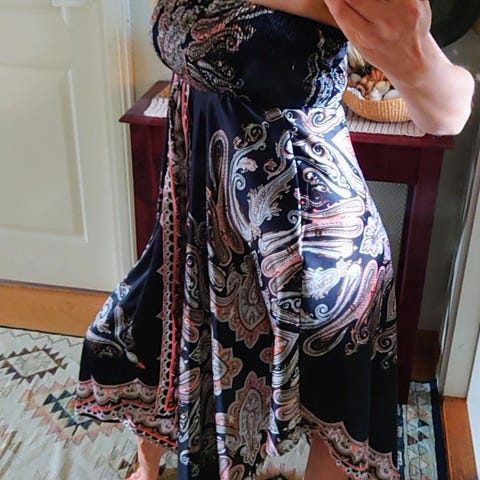 Vyötärö n. 33 (joustava kuminauha n. 53), vyötärö-helma 50 cm.