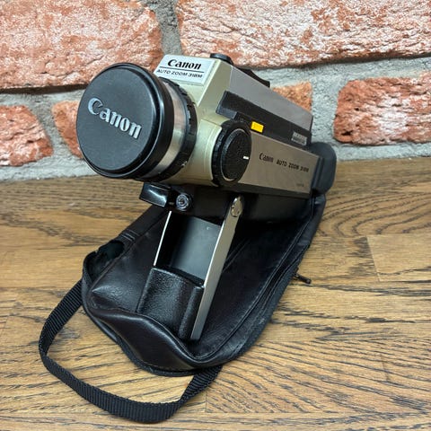 Canon Auto Zoom 518 kamera, musta väri. Tämä kamera on varustettu zoom-objektiivilla ja ergonomisella kahvalla helppoon käsittelyyn. Soveltuu erinomaisesti vintage-valokuvausprojekteihin tai kokoelmiin.