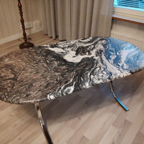 Marmorinen sohvapöytä. Jotain käytön jälkiä näkyy tietyssä valossa.