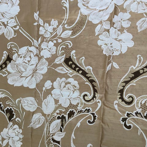 Puuvillaverho Designers Guildin kankaasta. Sivut ommeltu ja yläreunassa leveä rypytysnauha,jossa myös taskut verhokoukuille. Pituus 240 cm.
