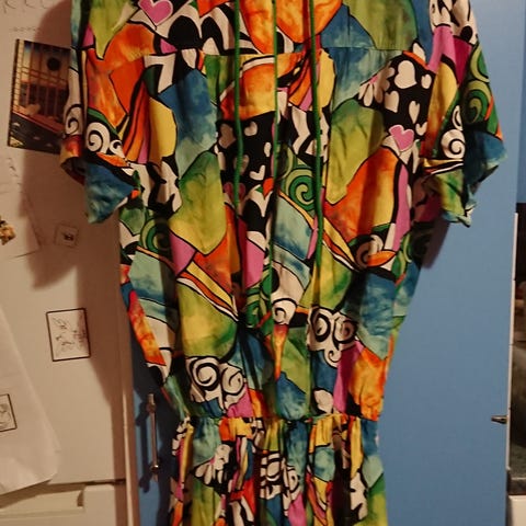 Hiukan A-linjainen takkimallinen tunika / minimekko jämäkkää kirjavaa vintage-puuvillaa. Kuosi on hyvin värikästä punaisen, turkoosinsinisen, vihreän ja ruskeankeltaisen ilottelua höyhenmäisinä kuvioina. Tunikan on valmistanut lappeenrantalainen Nahka- ja Kangastyö Eeva ja sen koko on noin 40.