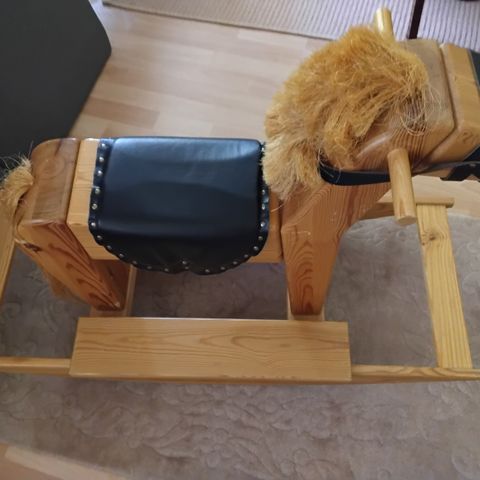 Puusepän tekemä kaunis puuhevonen. Tukeva ja vankka. On pidetty välillä lampaantaljaa päällä.