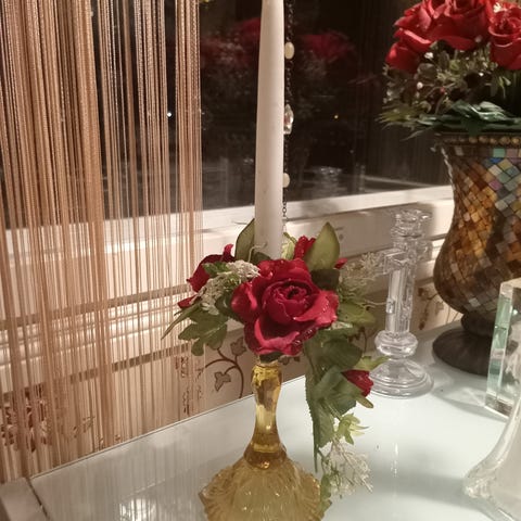 Myydän komea meripihkan värinen ja kirkasyökynttiläjalka.