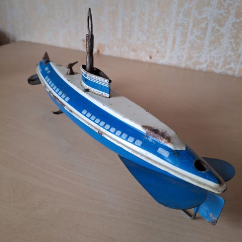 Adventure Submarine lelukulkuneuvo 2007, sininen väri. Tämä lelu on suunniteltu muistuttamaan sukellusvenettä ja siinä on yksityiskohtia, kuten siivet,luukun saa auki perästä ja edessä naru jos siitä vetää kuulostaa kuin moottori lähtisi käyntiin Sopii keräilijälle ja lasten leikkeihin.Puuttuu pari osaa.