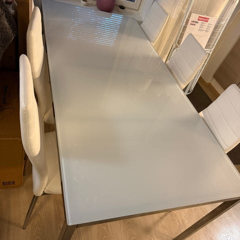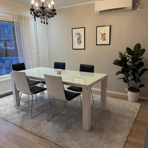 Todella hieno pöytä missä on neljä tuolia Pöydän päällä on lasi mikä on kirkas ja kauniin näköinen sen voi ottaa haluaessa pois mutta se kuuluu siihen olen ostanut sen itse erikseen se on ostettu viime kesäkuussa minulla ei ole kuitti tallessa muutoksen takia myyn aika paljon ja kokonaan hinta on 425 olen itse maksanut 1 200 € puolet ovat pehmeitä.