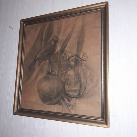Hannu Riikonen "Kukkakauppias kissoineen" lyijykynä mitat kehysten päältä korkeus n.50cm leveys n.40 kuva-ala n.28x20cm, vanhat kehykset