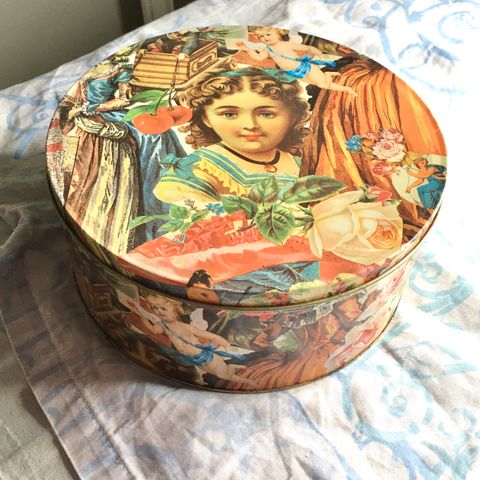 Tyylikäs pieni peltirasia – mustalla pohjalla kultaisia, valkoisia ja hopeisia lumihiutaleita. Erinomainen esim. koruille. Kansi ja pohja siistit.