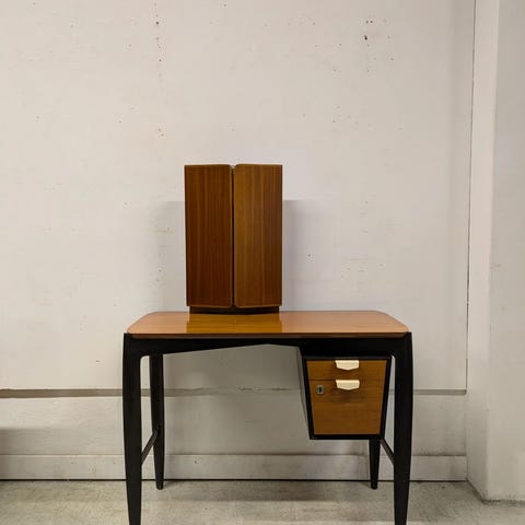 Huonokuntoinen kansilevy hiottu ja maalattu, muuten taitaa olla alkuperäiskunnossa, laatikot kuin uudet sisältä. Kromiputkissa kulumaa missä jalkoja pidetty. Kansilevyn suojaksi tehty joskus lasilevy, tulee mukaan.