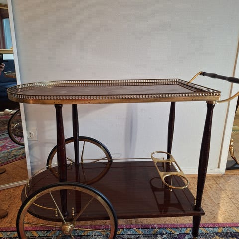 Upea antiikkinen juomakärry kultaisilla ja puisilla yksityiskohdilla. Kärry kotoisin Ranskan ja Belgian suunnilta.