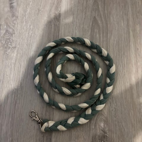 Vaaleanpunainen keppihevosen riimu ja tumman violetti riimunnaru. Riimunnarussa käytön jälkeä, lähtenyt nukkaantumaan.