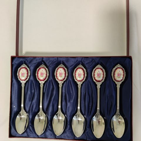 Kaksi pientä kukkakahvallista ja yksi isompi ruusukahvallinen. Palkintolusikoita, takana 1.- ja 3.-paikkasijoituskaiverrukset.