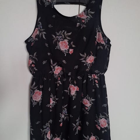 Musta-punainen kukallinen juhlamekko. Kerran tai kaksi käytetty. Halterneck tyylinen yläosa. Vetoketjukiinnitys myös.
