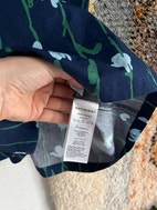 Kerran juhlissa käytetty Marimekon Tarika Viivakukka- mekko, mukana vyö. Tummansininen pohjaväri.