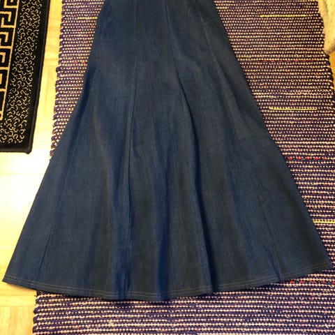 Uudenveroinen pitkä Fransa-farkkuhame. Ostettu Sokokselta. Laadukas materiaali ja ompelu. Etuosassa alkuperäinen kulutus/kivipesu.