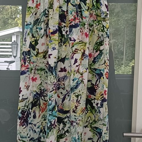 Kaunis pitkä vähän käytetty kesämekko. Koko 36D. Pituus olkasaumasta mitattuna n. 130 cm, rinnanymp. n. 100 cm = mitattu levitettynä, kangas joustaa sivusuunnassa. Vuori.