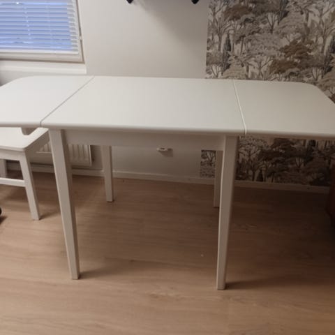 Myynnissä tämä hieno ja suureksi avattava puinen klaffipöytä, joka joskus on maalattu valkoiseksi. Tämän äärelle mahtuu isompikin porukka, ja suljettunakin on mukavan syvä. 🙂 Sivuista saa 69,5cm lisää mittaa per puoli.