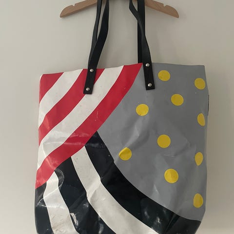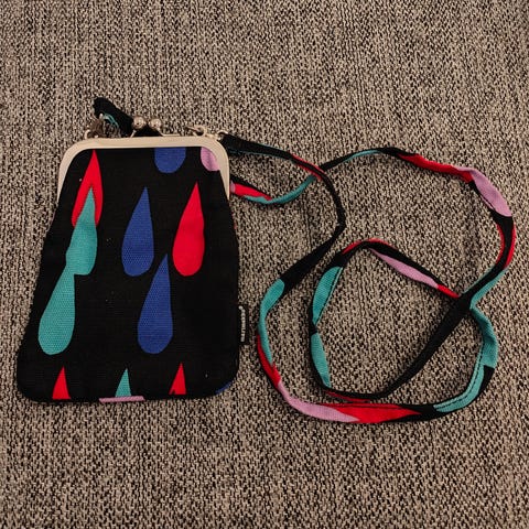 Marimekon Pisaroi -laukku. Ollut löytössä joten kankaassa pieniä kulumia mutta laukku on edelleen hyvässä kunnossa. Hihnan saa irroitettua.