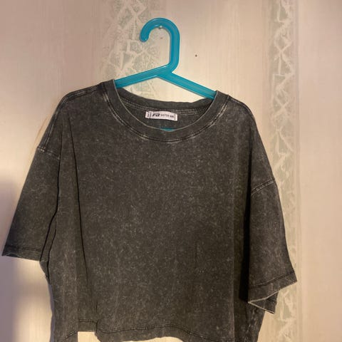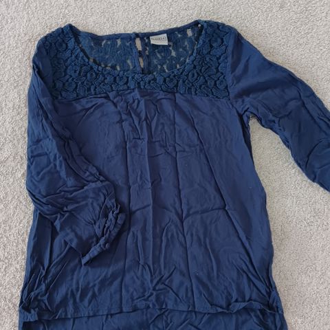 Lyhyt vaaleansininen toppi, jossa pitsireunat.