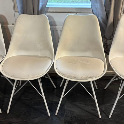 Metallirankaiset ruokapöydän tuolit kankaisella istuimella ja selkänojalla. Käsinojan korkeus maasta 65 cm. Myydään kimpassa 4 kpl.