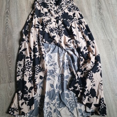Vain päälle sovitettu hame kokoa S. Vyötäröllä kunauha eli joustaa hyvin. Pituus on puoleen väliin reittä.