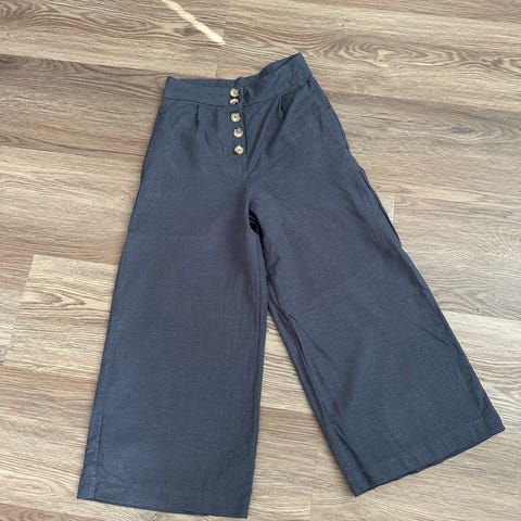 Pellavaa 55%, loput viskoosia. Aika matala vyötäröiset. Leveät lahkeet.