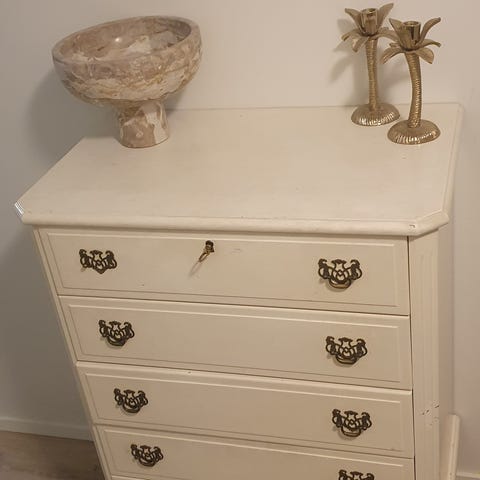 Kuvan mukainen ok kunnossa oleva vanha senkki. Ilmeisesti koivua. Lakkapinnassa naarmuja. Ylälokeron avain ja lukko toimii vaikka yksi ruuvi puuttuu lukon kiinnityksestä.