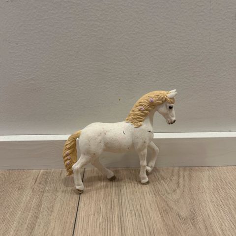 Valkoinen Schleich hevonen, joka on täysin ehjä ja aito. Hevosella on violetteja koristeita harjassa.