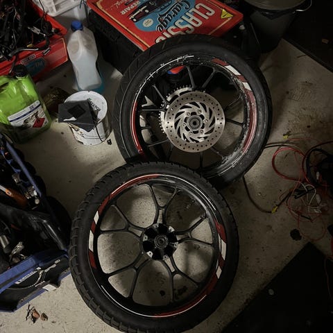 Mopon renkaat on molemmat hyvässä kunnossa. Etukumin koko on 120/70-17 ja takakumi 130/80-17. Voin myydä myös kumit erikseen.