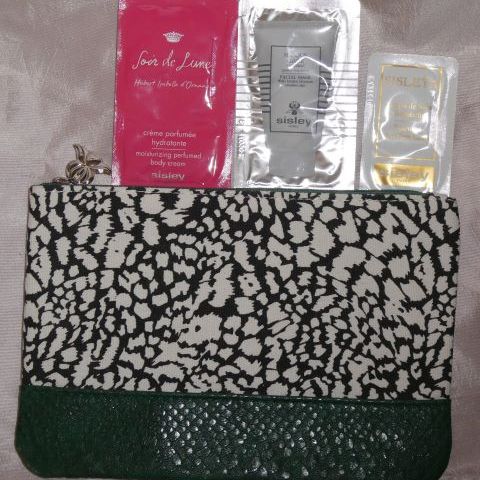 Käyttämätön pieni laukku, meikkipussi tai kirjekuorilaukku, aito merkkituote. Koko noin 20,5 x 14 cm. Etuosassa vihreä koristepaneeli, takaosassa pelkkä mustavalkoinen leopardikuvio, ihana logohela vetoketjussa, sisällä kevyt vihreä vuorikangas. Saman valmistajan pienet näytekokoiset ihonhoitotuotteet saa laukun mukana, tässä kosmetiikkasetissä silmänaamio, silmänympärys-/huulivoide, kasvoseerumi.