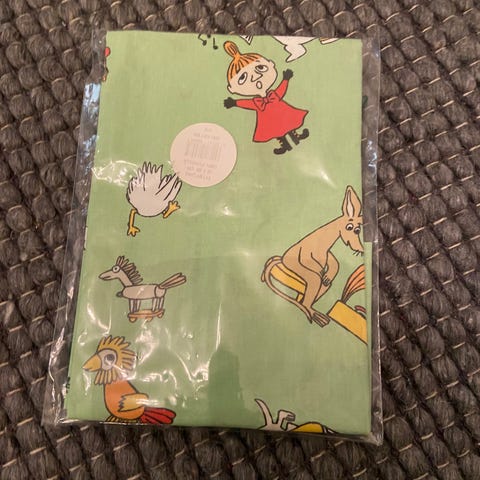 54 x 36 cm tyynynpäällinen Muumi puuvillakangasta, jossa on vaaleankeltainen pohjaväri.