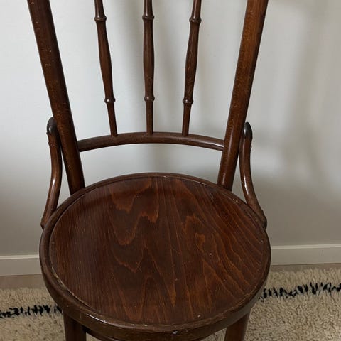 Kuvien mukainen wieniläistuoli. Kestää istua, mutta kuten kuvista näkyy, istuin osassa purkaumaa + painaumaa.