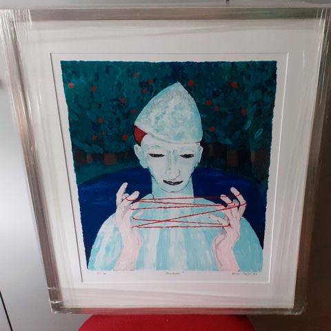 Alice Kaira "Klovnin kutsu" 60/140 serigrafia mitat kehysten päältä korkeus n.61cm leveys n.51,5cm kuva-aukko korkeus n.42cm leveys n.33cm, löytyy myös kehystämättömänä