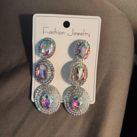 Kevyet muoviset läpikuultavat roikkuvat korvakorut, joissa kimalletta. Pituus n. 10 cm, leveys 4 cm.