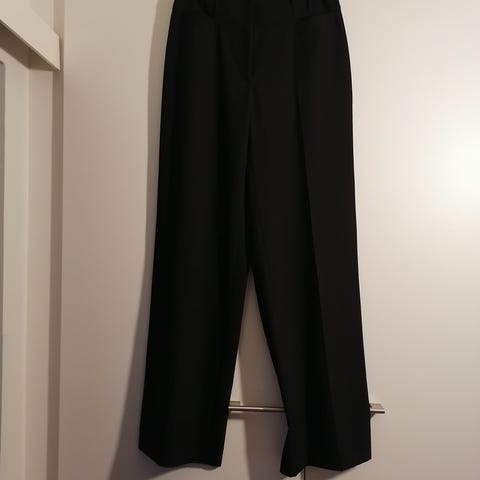 Mustat simppelit suoralahkeiset housut. Merkitty koko 36 mutta ovat mielestäni enemmänkin 38 kokoiset. Housuissa taskut ja vyötärö kuminauhalla. Lahkeen pituus 64cm ja vyötärö 78cm. Käytetyt mutta edelleen hyvin siistit