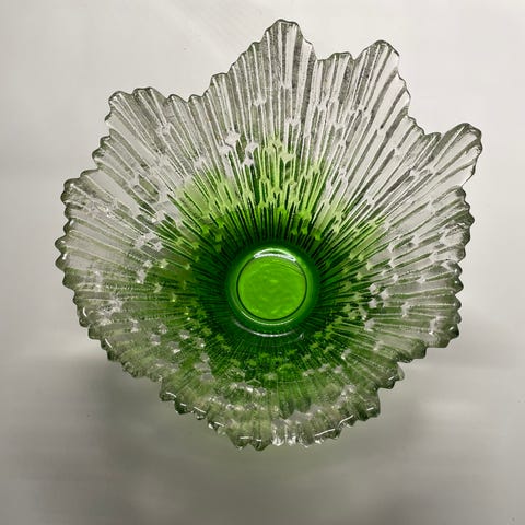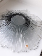 Tauno Wirkkalan Humppilan lasille suunnittelema laakea harmaa/kirkas Revontulet-lasivati/kulho. Halkaisija suurimmillaan noin 38 cm.