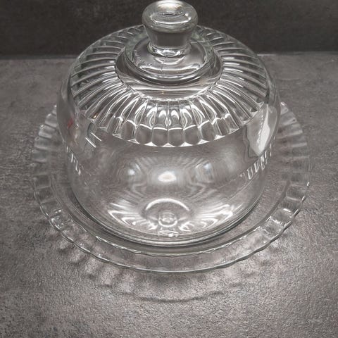 Kuva 1 ja 2 . Ranskalainen iso lasikupu, kuvun halkaisija 27 cm, lautasen halkaisija 32 cm, kuvun korkeus nupin kanssa 16 cm, virheetön, 25 eur