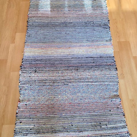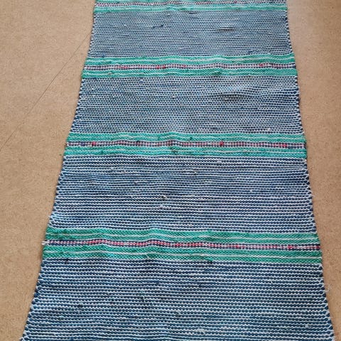 Aito käsinkudottu räsymatto. Värien ja materiaalien osalta soveltuu hyvin vaikkapa saunan pukuhuoneen matoksi tai takkatupaan, huvimajaan, parvekkeelle tai terassille. Siistit suorat reunat ja päät solmittu kestävin helmisolmuin ilman hapsuja. Napakka kudos.
