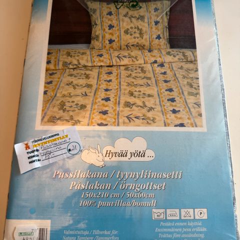 Pussilakana 150 x 210 cm, tyynyliina 50 x 60 cm, 100% puuvilla.