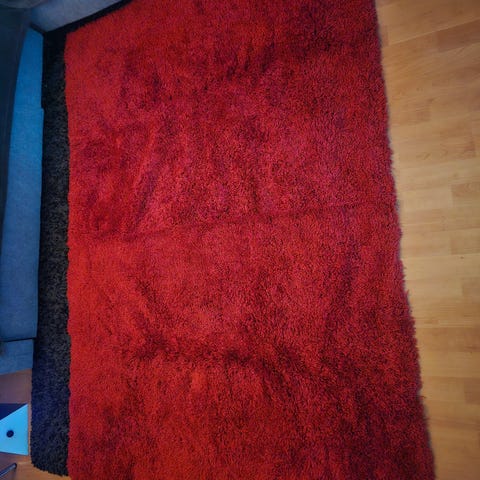 Juuri käsin pesulla ja kuivattu tilauksella kaksipuoleinen matto olohuoneeseen. Iso ja hyvin lämmin (pidetty parisängyn petarin päällä talvella). Mattoa ei juurikaan lattialle ole käytetty.
