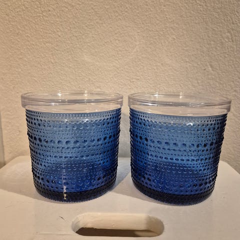 Kaksi keltaista Iittalan kastehelmi peltipurkkia kansineen. Halkaisija 21cm, korkeus 7cm.